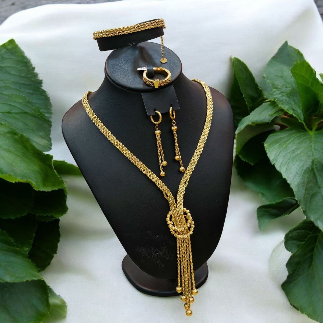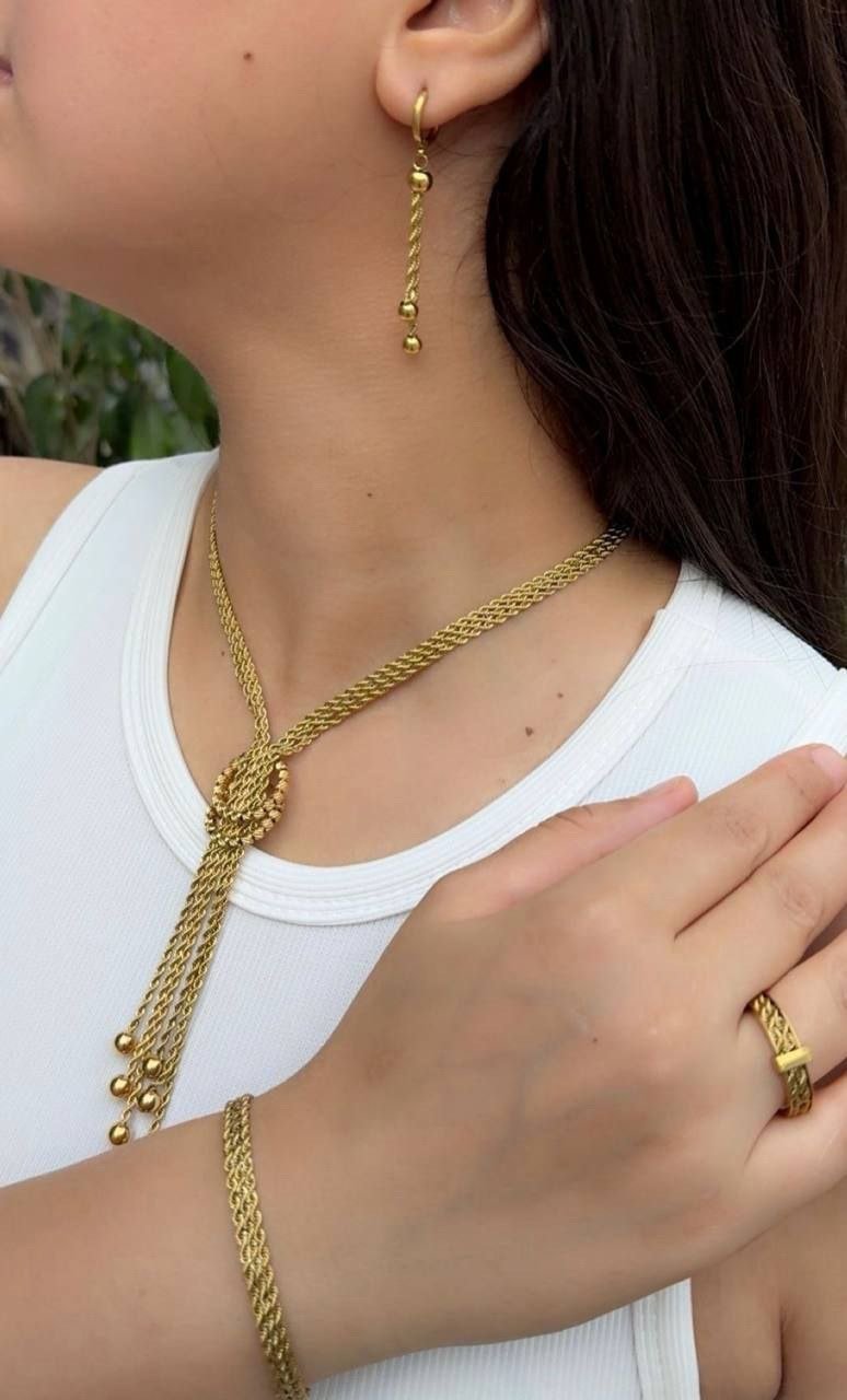 Le set met en avant la maille krifcha torsadée et un nœud perlé d’où tombent des chaînettes à pampilles. Le rendu est lumineux sans être lourd : le collier allonge la silhouette, les boucles soulignent le visage, le bracelet suit le poignet et la bague apporte la touche finale. Conçue pour durer, la parure garde son éclat et ne noircit pas.