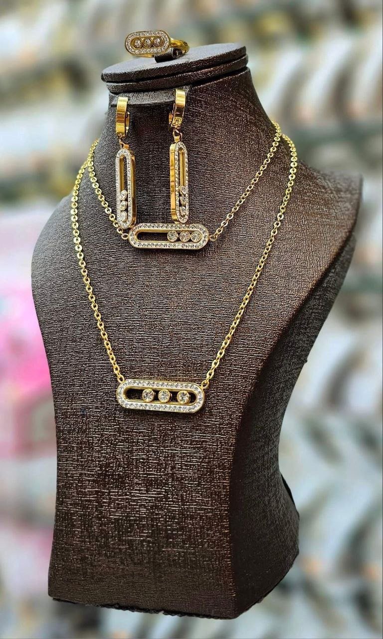 • Composition : 4 pièces – collier, boucles d’oreilles pendantes, bague et une chaine