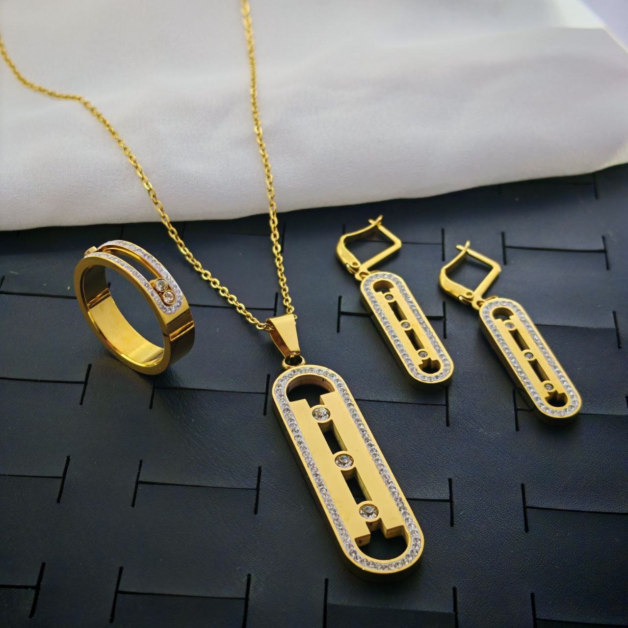 Cette parure contemporaine en plaqué or séduit par son design structuré et ses détails géométriques. Composée d’un collier, d’une bague et de boucles d’oreilles, chaque pièce présente une forme allongée sertie de zircons scintillants. L’équilibre entre lignes nettes et éclat cristallin fait de cet ensemble un choix sophistiqué et résolument moderne.
